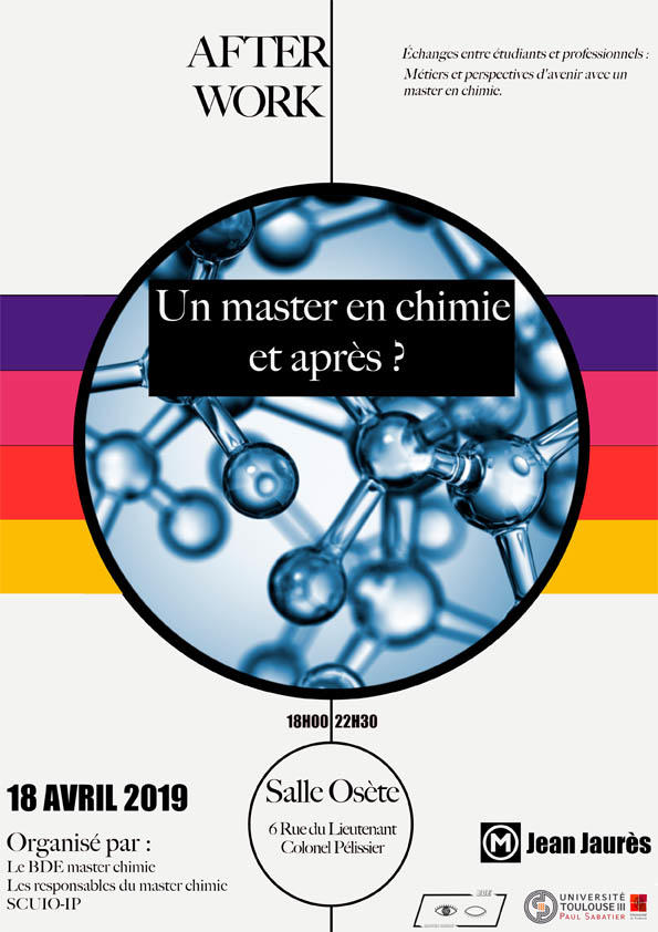 une préparation à l’insertion professionnelle : simulations d’entretiens RH, rencontre avec des industriels lors de l’AfterWork annuel du Master de Chimie, participation au congrès régional de l’Afsep, participation au groupe LinkedIn du master, et autres enseignements dédiés (gestion de projet, notion de management, implication associative,…).
